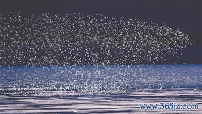 r镜头从城市转向滨海。正巧候鸟移动季,成群的勺嘴鹬在盐城东台市便条泥湿地遨游,样式蔚为壮不雅。