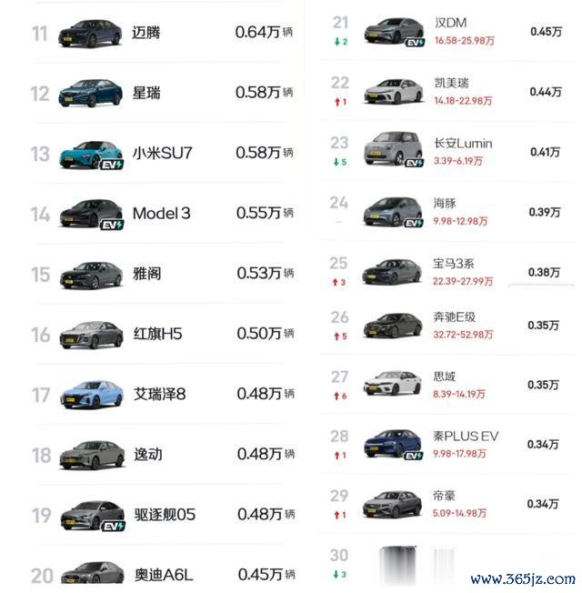 终末再来望望,迈腾0.64万辆,星瑞,小米SU7,ModeI3,雅阁,红旗H5,推崇王人中规中矩,销量均在0.50万-0.58万辆之间。艾瑞泽8,逸动,结果舰05,凯好意思瑞,不及0.50万辆,海豚,良马3系,疾驰E级王人在0.40万辆以下,秦PLUSEV,帝豪,位居第28-第29名,推崇王人相比一般,本周销量王人仅有0.34万辆阁下!
